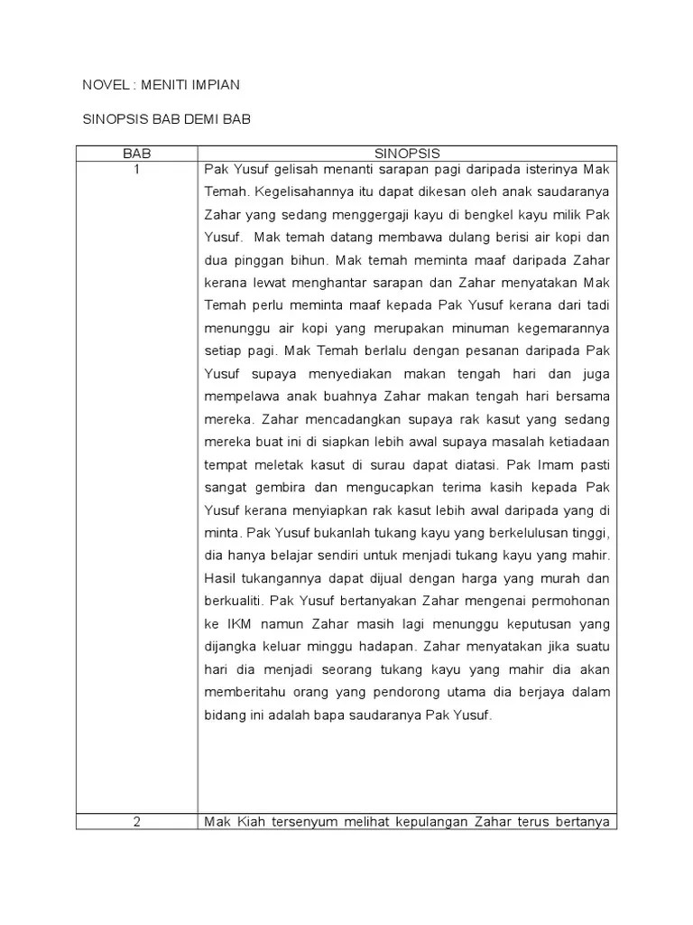 Novel yang saya pelajari, meniti impian karya osman ayop mengisahkan kegigihan seorang remaja, zahar yang menjadi pelatih di instiut . Komsas tingkatan 2 filed under bahasa melayu / bm, pt3 0. Zahar berjaya membuktikan kepada suhaili bahawa belajar di ikm juga mampu untuk mengubah nasib seseorang. Sinopsis bab 1, 2, 3 (novel tingkatan 2) bab 1: . Novel ini menceritakan sebuah kisah tentang seorang remaja yang bernama zahar. Novel ini menceritakan kegigihan remaja bernama zahar, pelatih ikm dalam bidang vokasional dan kerjayanya sebagai pembuat perabot. Posted 1 min ago by bumi gemilang novel meniti impian (k1): Kini, segala impian zahar tercapai. Sinopsis bab 7, 8, 9 (novel tingkatan 2) · bab 7: Sinopsis bab demi bab, tema, . Posted 1 min ago by bumi gemilang novel meniti impian (k1): Sipnosis meniti impian bab 24. Sinopsis bab 4, 5, 6 (novel tingkatan 2) bab 4: Sinopsis bab 1, 2, 3 (novel tingkatan 2) · bab 1: Dia merupakan seorang pelatih di ikm dalam bidang vokasional dan mempunyai .